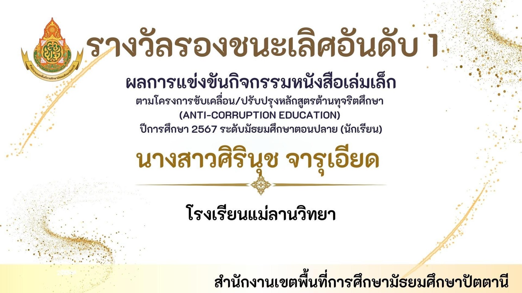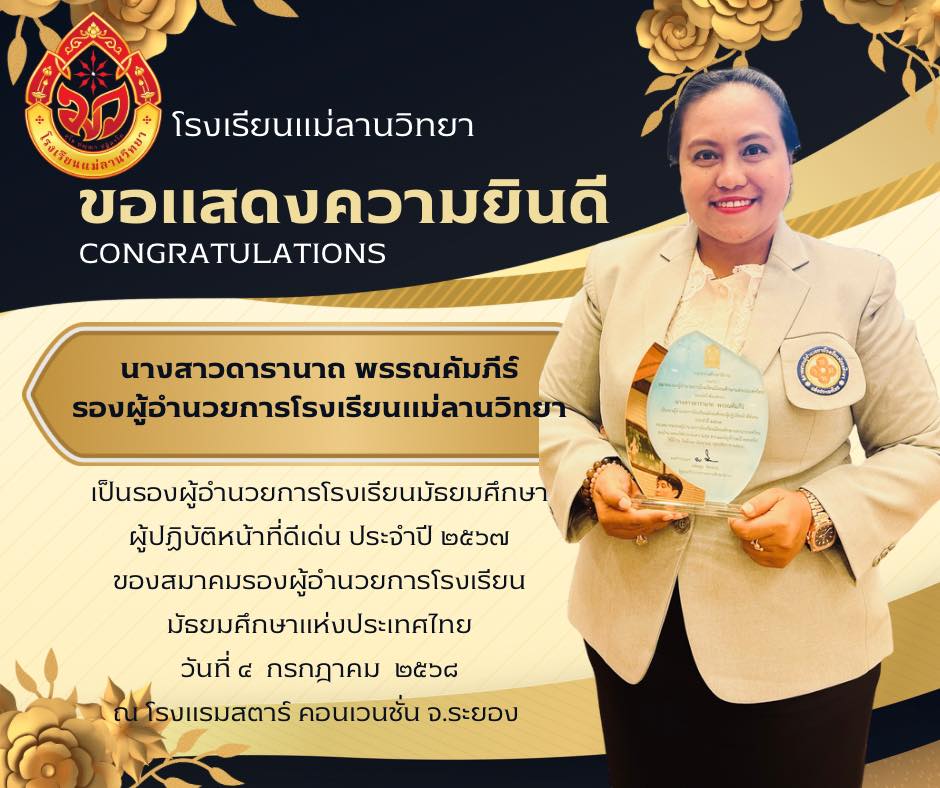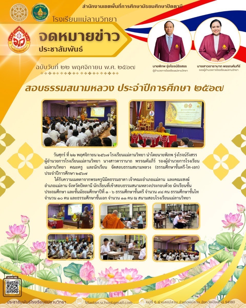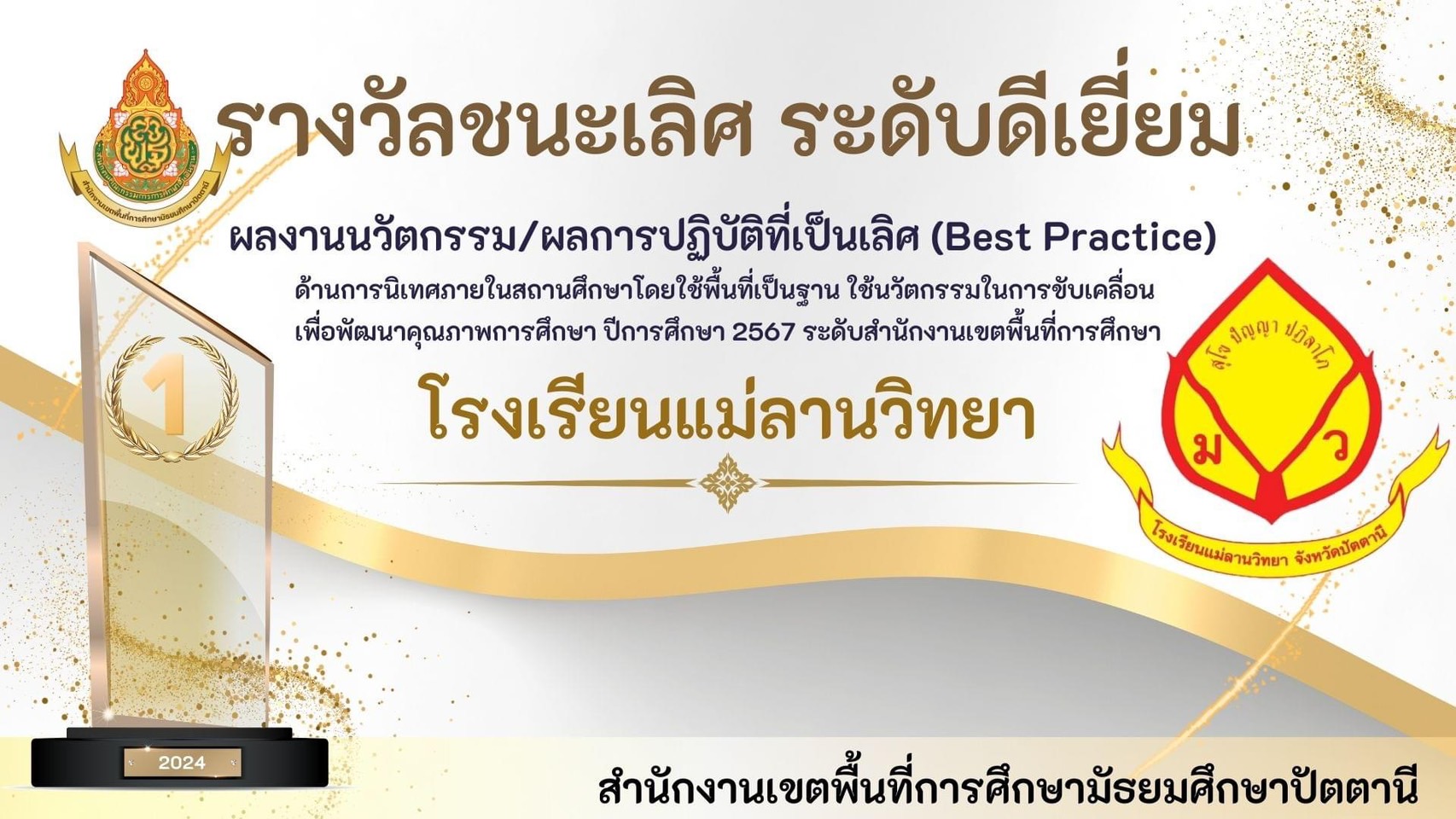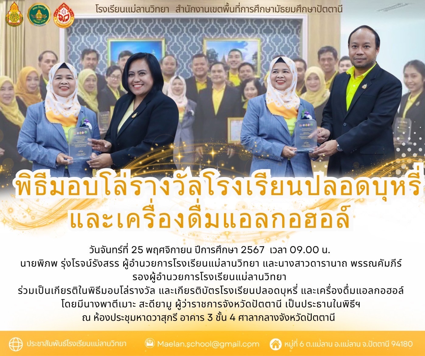 นายพิภพ รุ่งโรจน์รังสรร ผู้อำนวยการโรงเรียนแม่ลานวิทยา และนางสาวดารานาถ พรรณคัมภีร์ รองผู้อำนวยการโรงเรียนแม่ลานวิทยา เข้าร่วมพิธีมอบโล่รางวัลโรงเรียนปลอดบุหรี่และเครื่องดื่ม แอลกอฮอล์ โดยมีนางพาตีเมาะ สะดียามู ผู้ว่าราชการจังหวัดปัตตานี เป็นประธานในพิธี ณ ศาลากลางจังหวัดปัตตานี