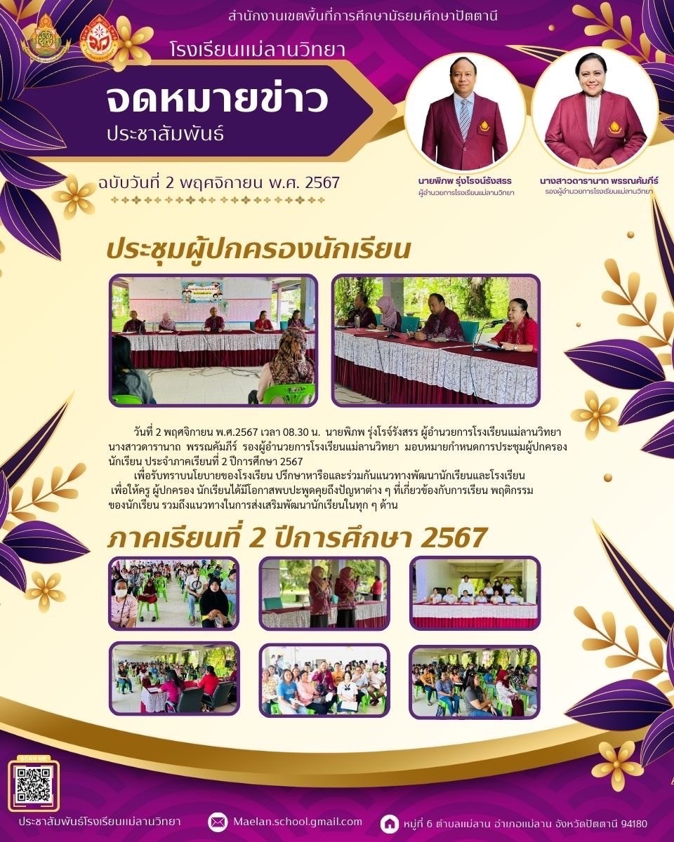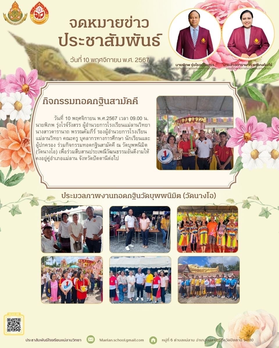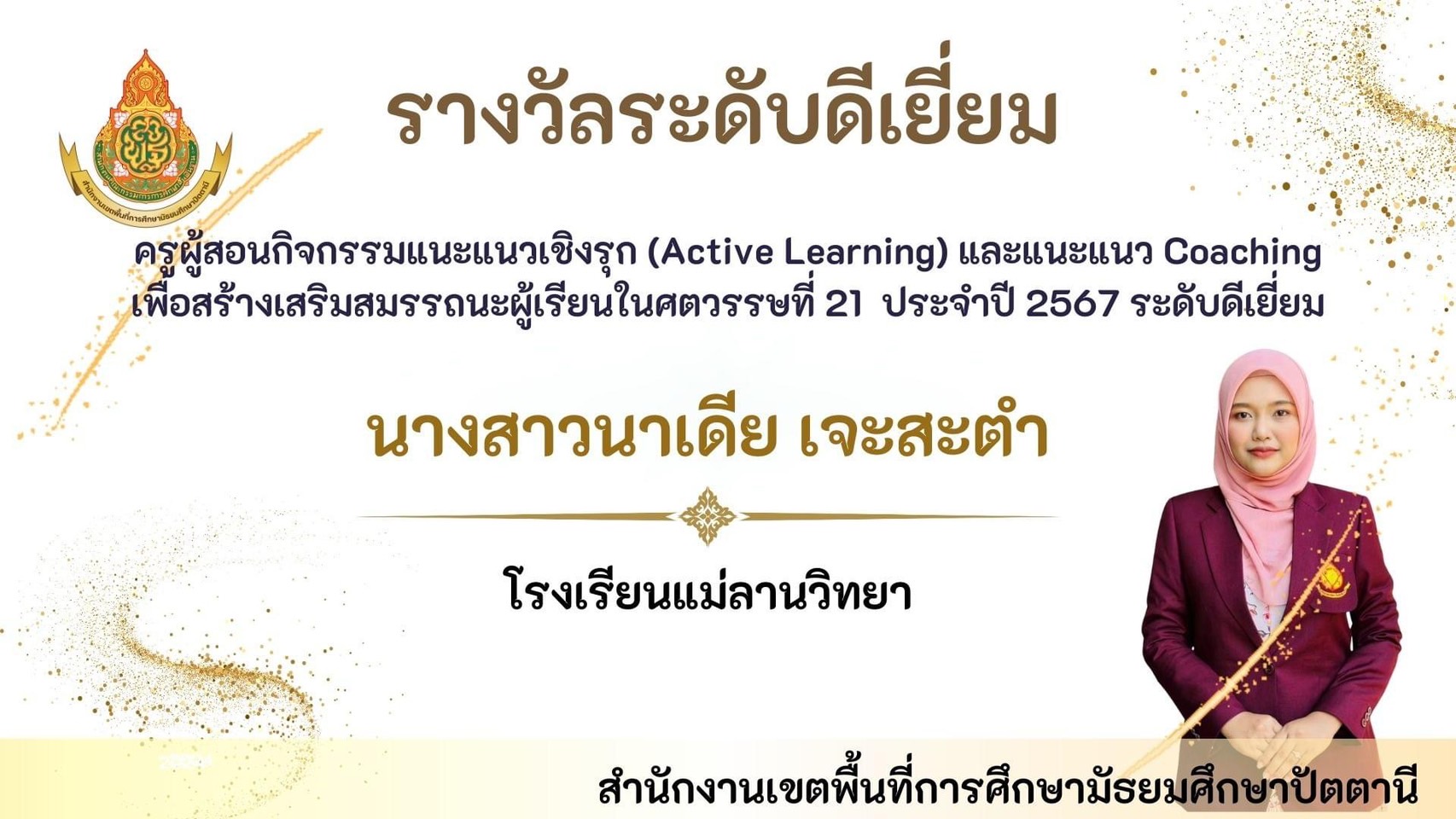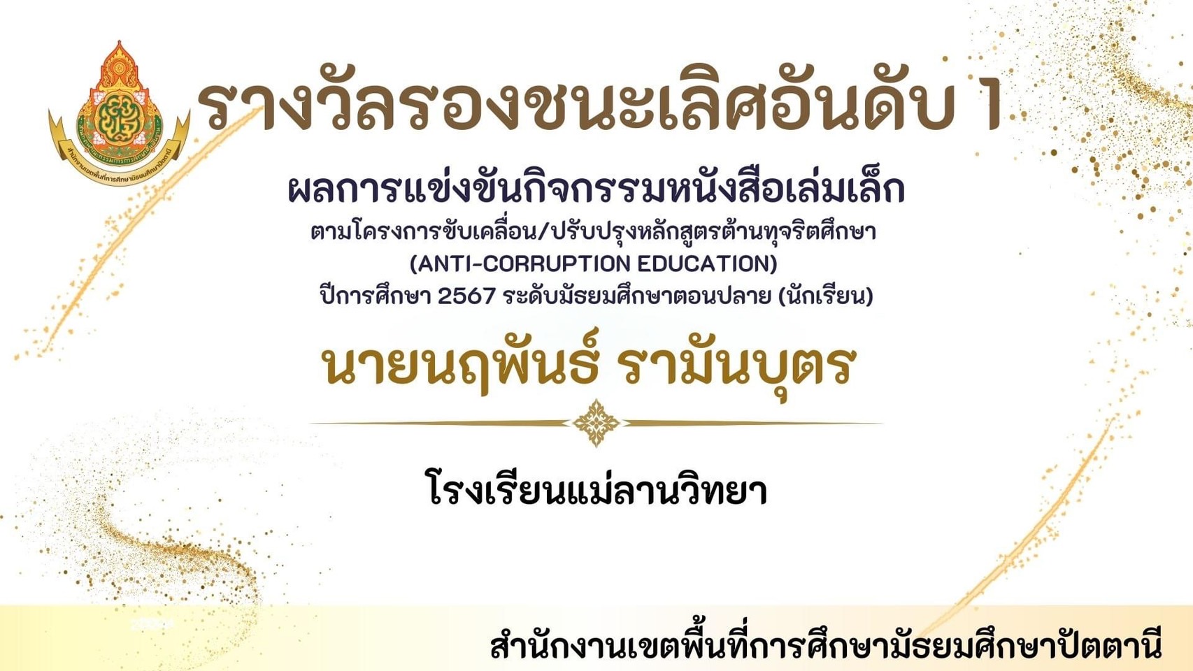 นายพิภพ รุ่งโรจน์รังสรร ผู้อำนวยการโรงเรียนแม่ลานวิทยา และนางสาวดารานาถ พรรณคัมภีร์ รองผู้อำนวยการโรงเรียนแม่ลานวิทยา เข้าร่วมพิธีมอบโล่รางวัลโรงเรียนปลอดบุหรี่และเครื่องดื่ม แอลกอฮอล์ โดยมีนางพาตีเมาะ สะดียามู ผู้ว่าราชการจังหวัดปัตตานี เป็นประธานในพิธี ณ ศาลากลางจังหวัดปัตตานี