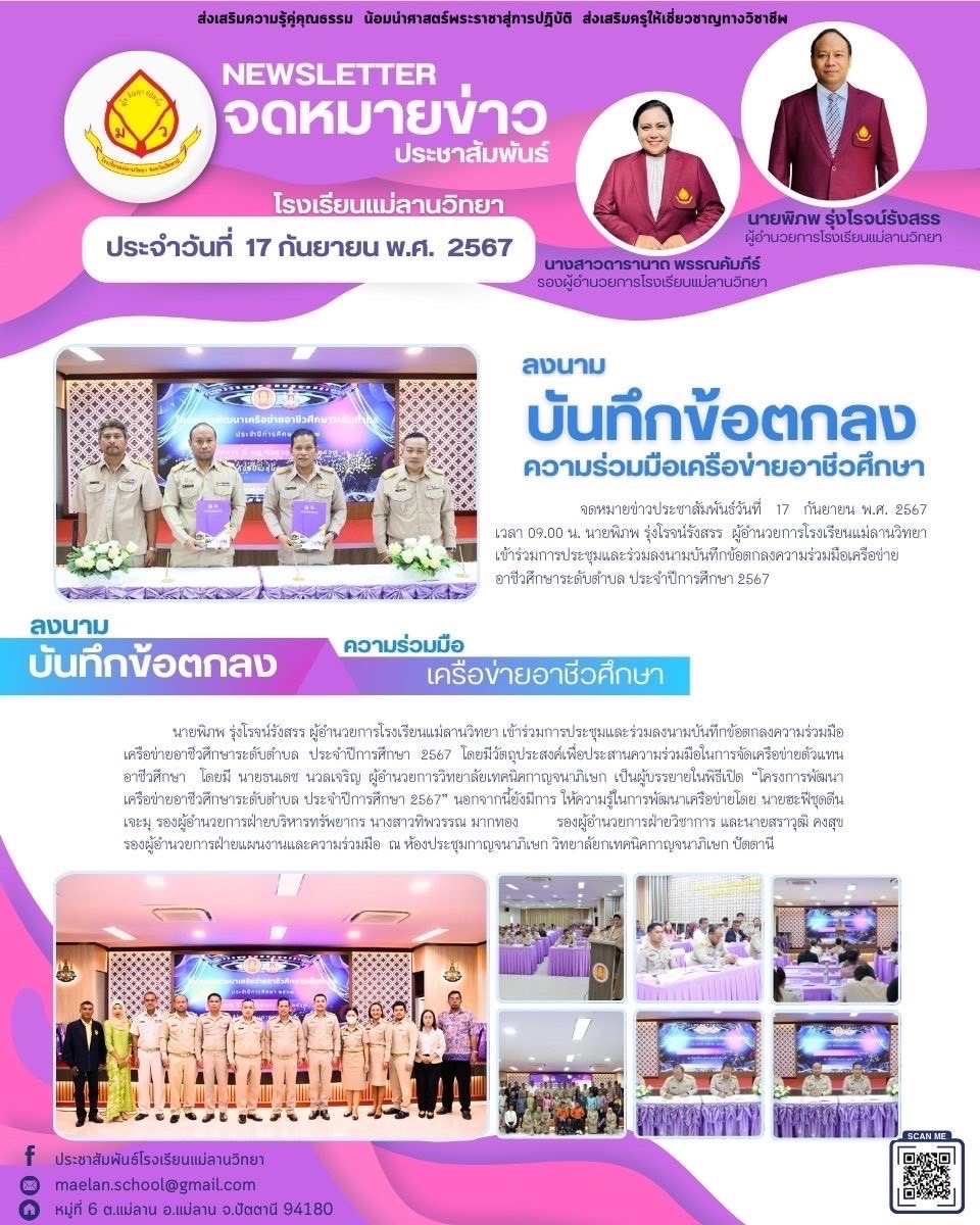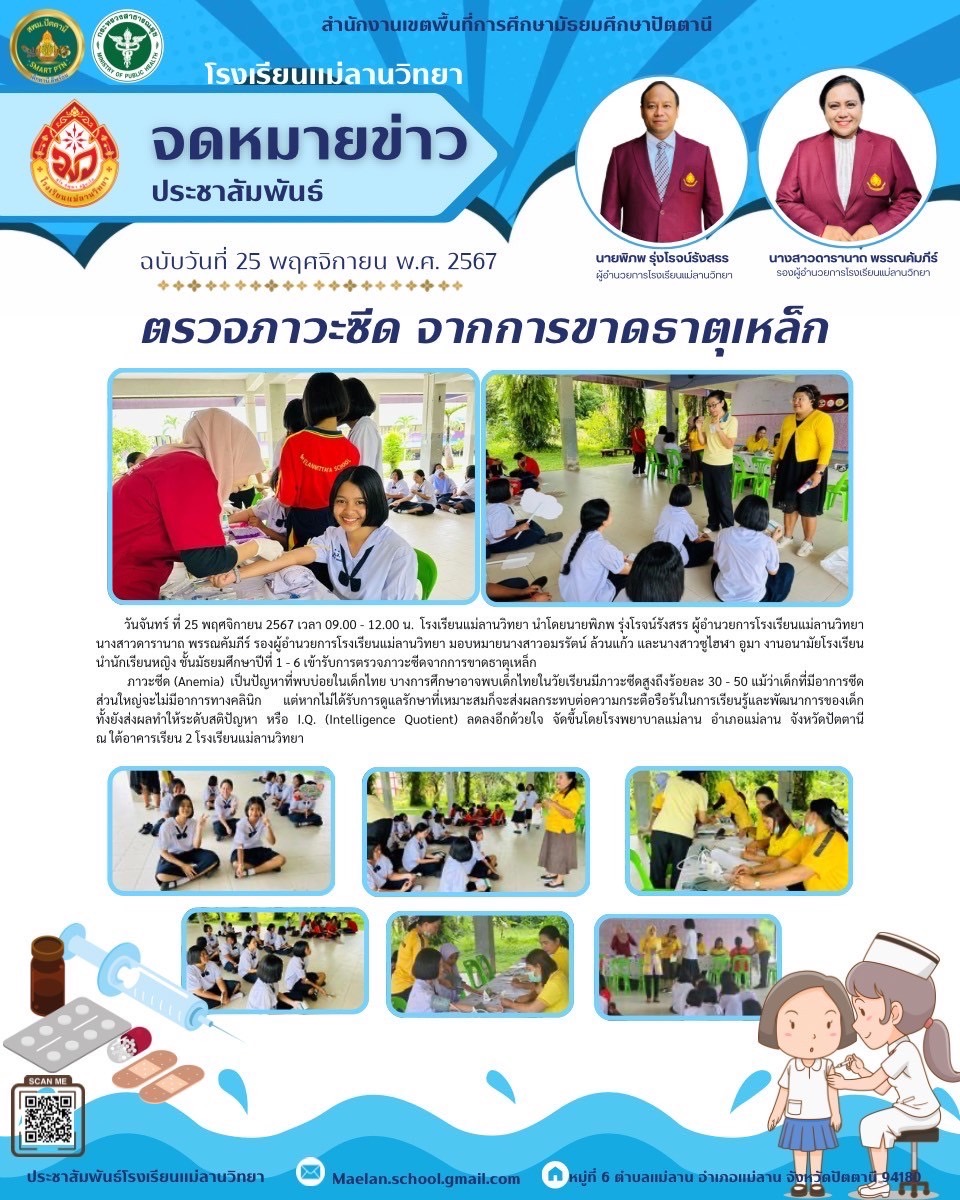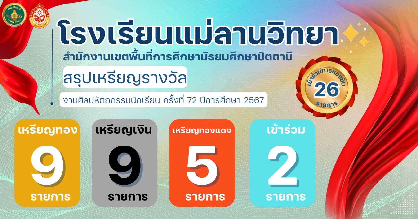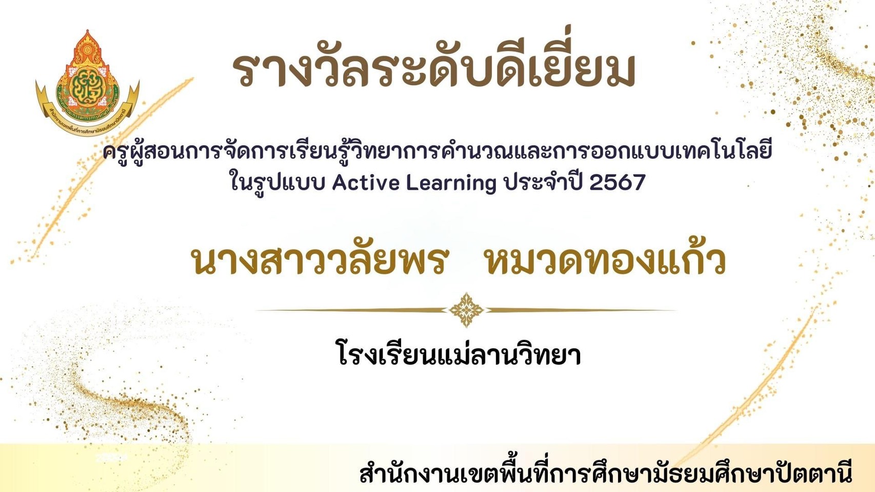 นายพิภพ รุ่งโรจน์รังสรร ผู้อำนวยการโรงเรียนแม่ลานวิทยา และนางสาวดารานาถ พรรณคัมภีร์ รองผู้อำนวยการโรงเรียนแม่ลานวิทยา เข้าร่วมพิธีมอบโล่รางวัลโรงเรียนปลอดบุหรี่และเครื่องดื่ม แอลกอฮอล์ โดยมีนางพาตีเมาะ สะดียามู ผู้ว่าราชการจังหวัดปัตตานี เป็นประธานในพิธี ณ ศาลากลางจังหวัดปัตตานี