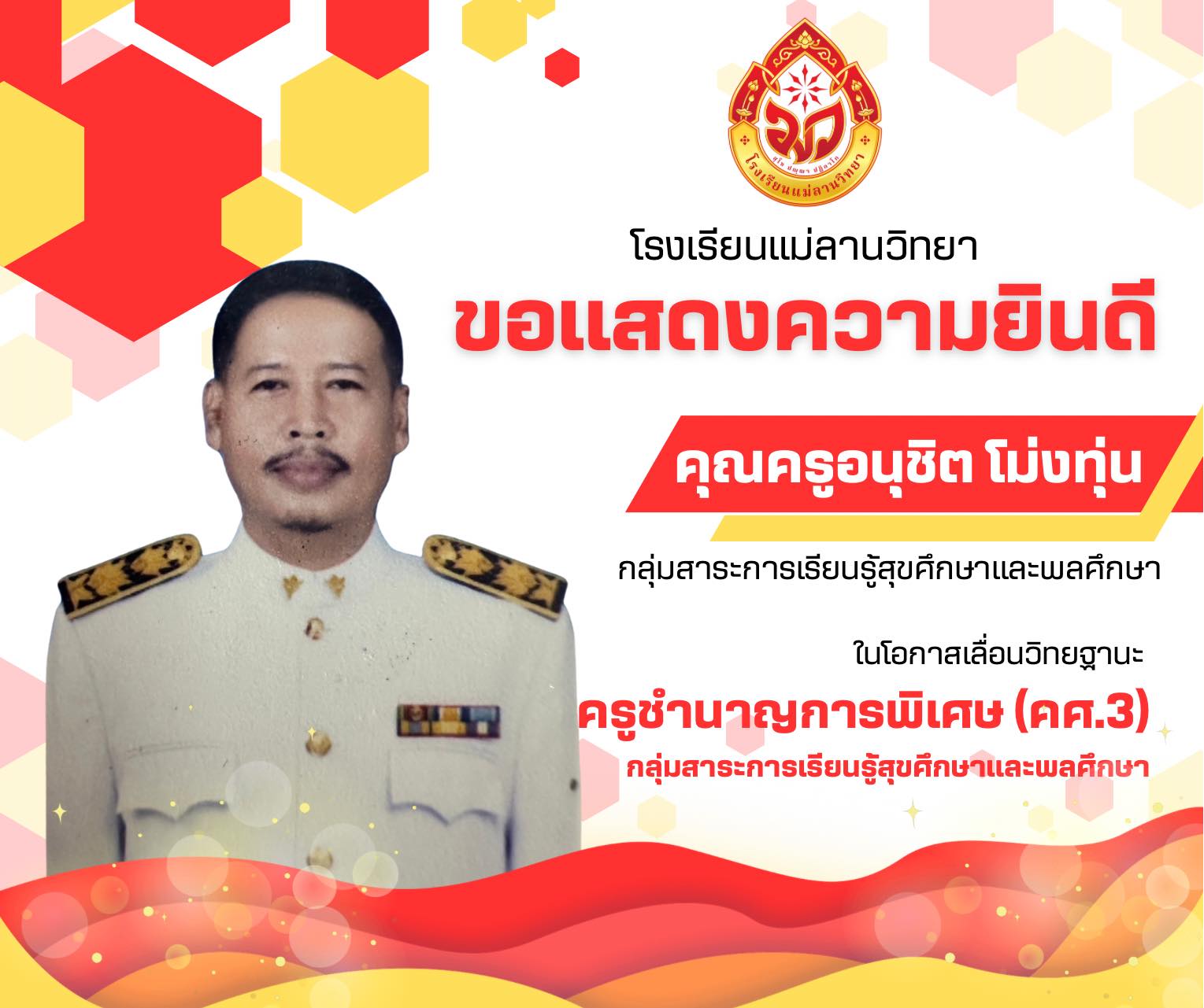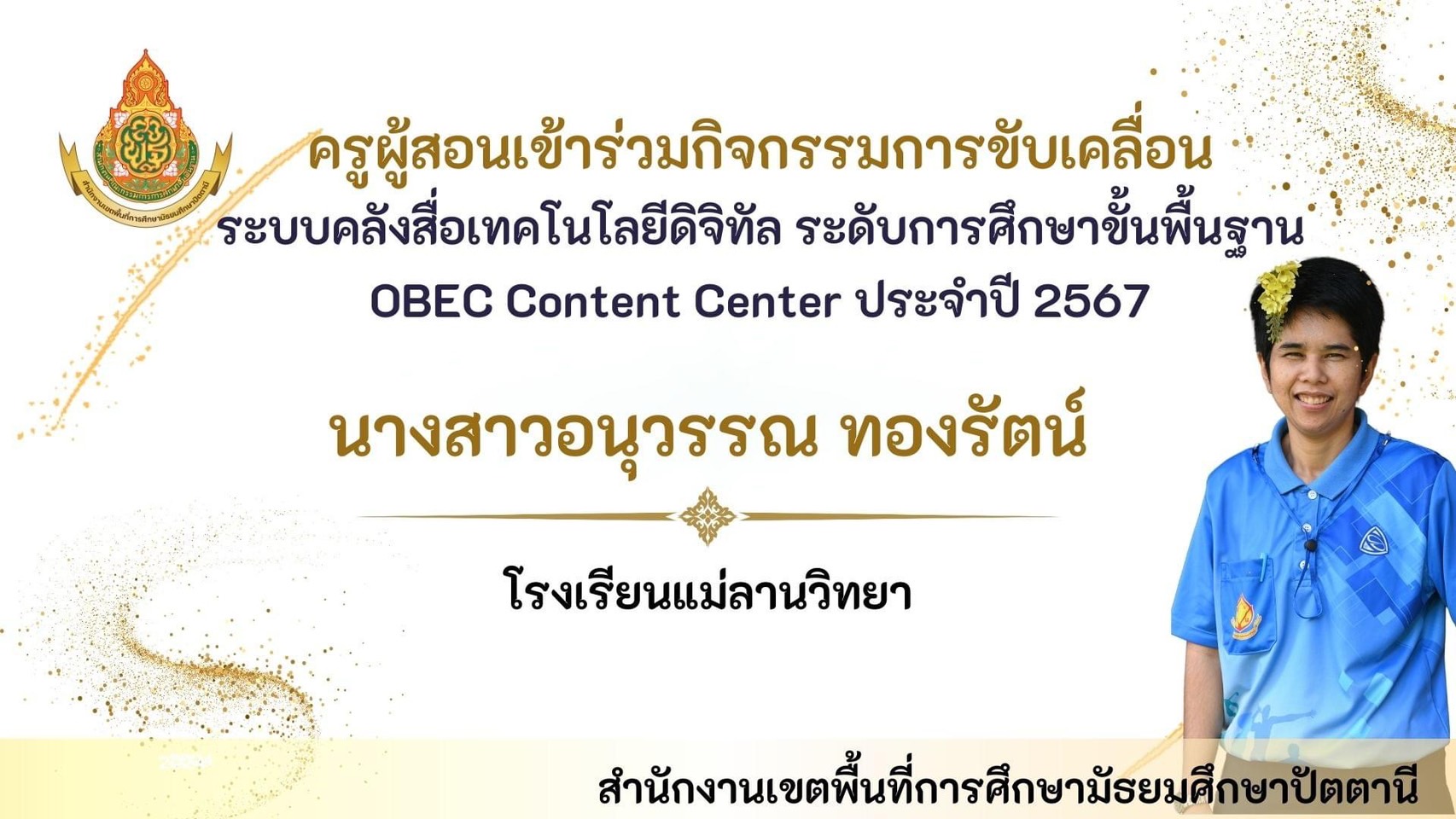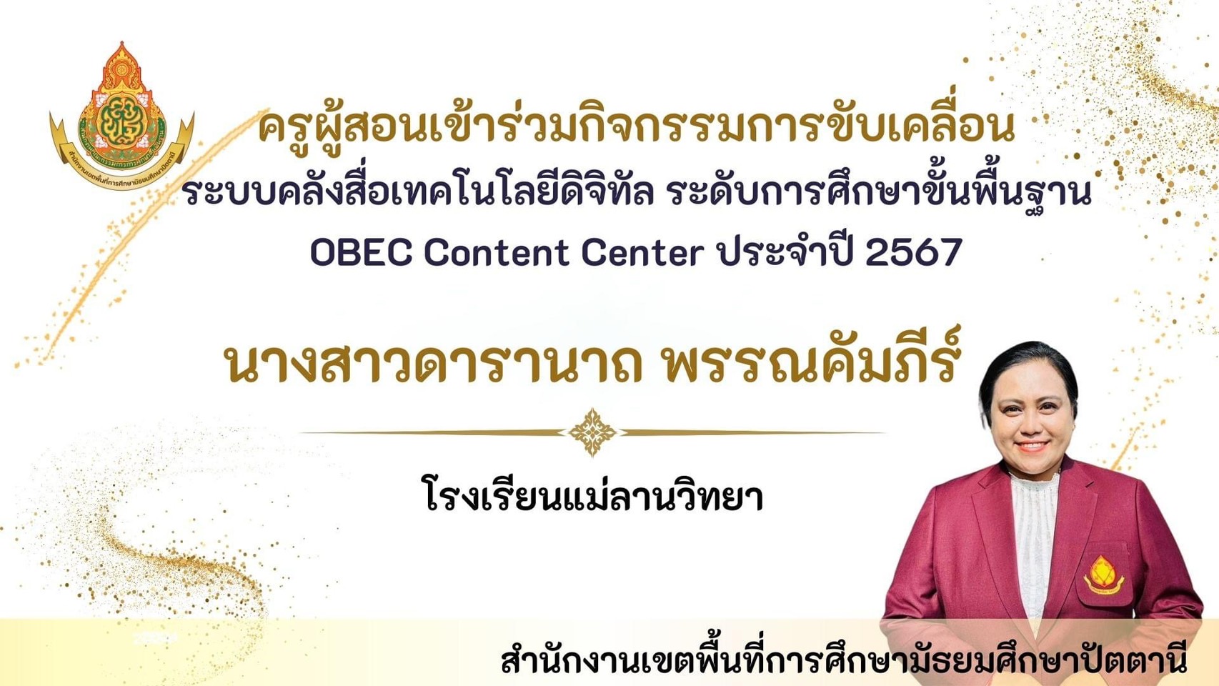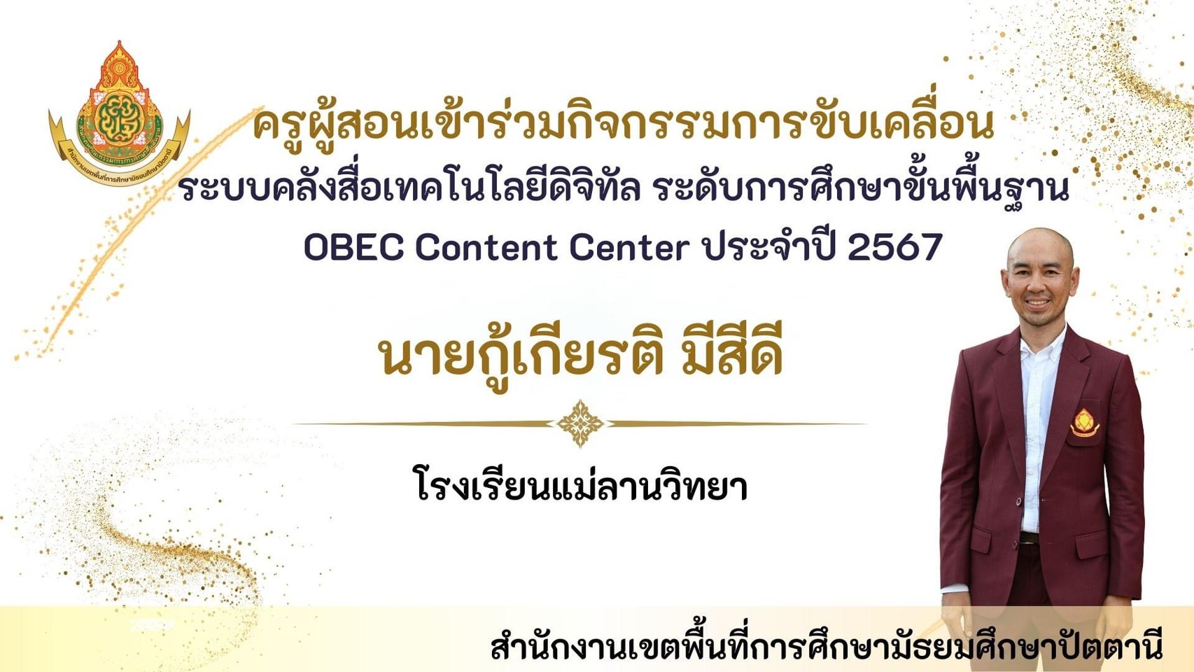 นายพิภพ รุ่งโรจน์รังสรร ผู้อำนวยการโรงเรียนแม่ลานวิทยา และนางสาวดารานาถ พรรณคัมภีร์ รองผู้อำนวยการโรงเรียนแม่ลานวิทยา เข้าร่วมพิธีมอบโล่รางวัลโรงเรียนปลอดบุหรี่และเครื่องดื่ม แอลกอฮอล์ โดยมีนางพาตีเมาะ สะดียามู ผู้ว่าราชการจังหวัดปัตตานี เป็นประธานในพิธี ณ ศาลากลางจังหวัดปัตตานี