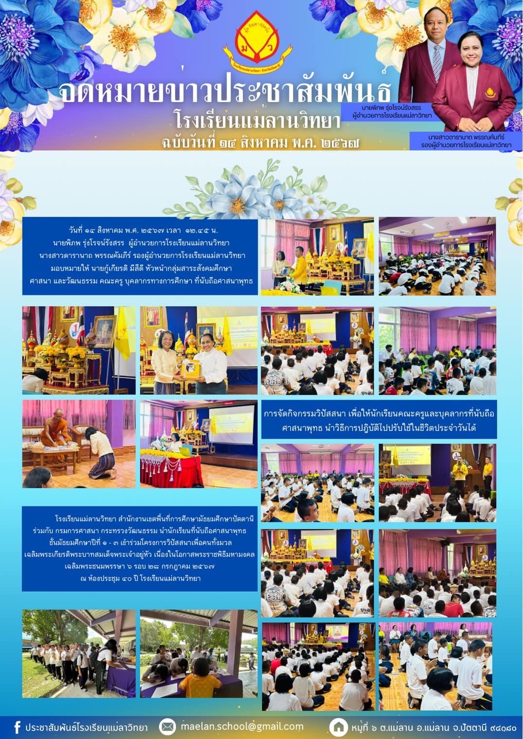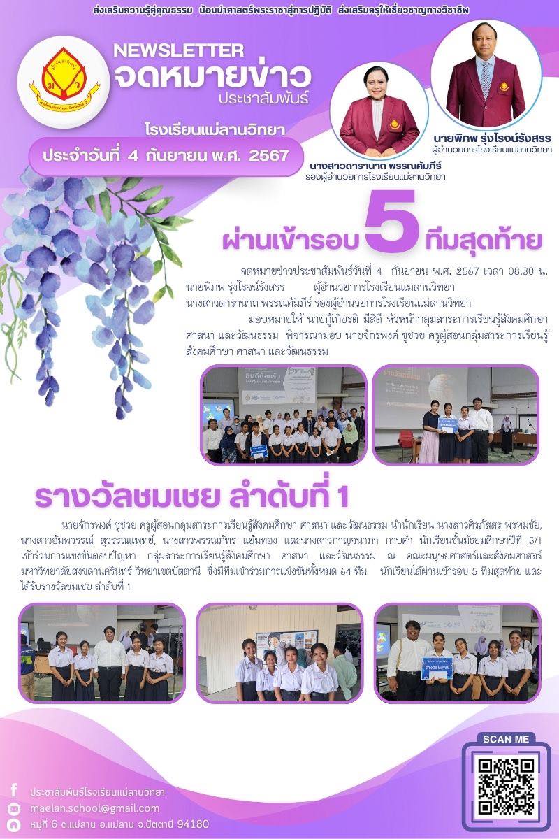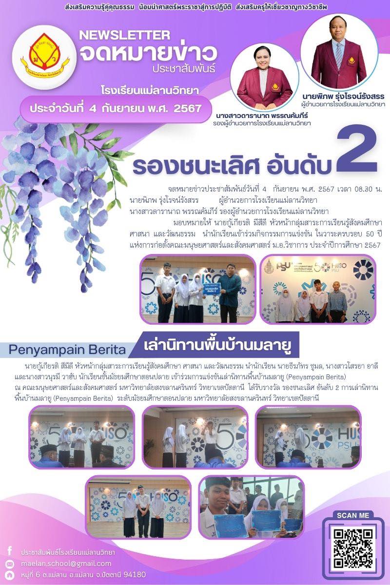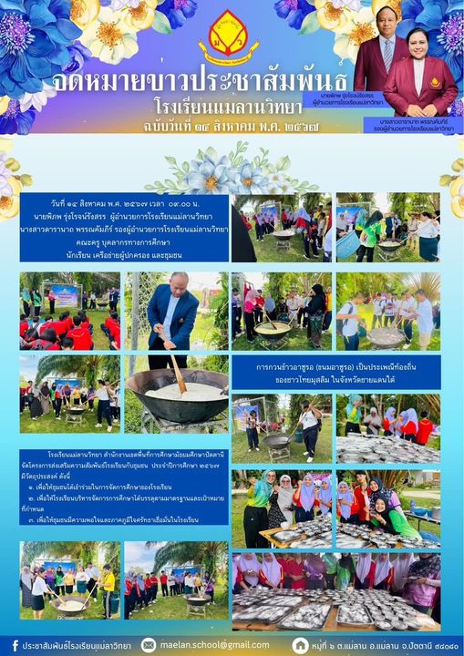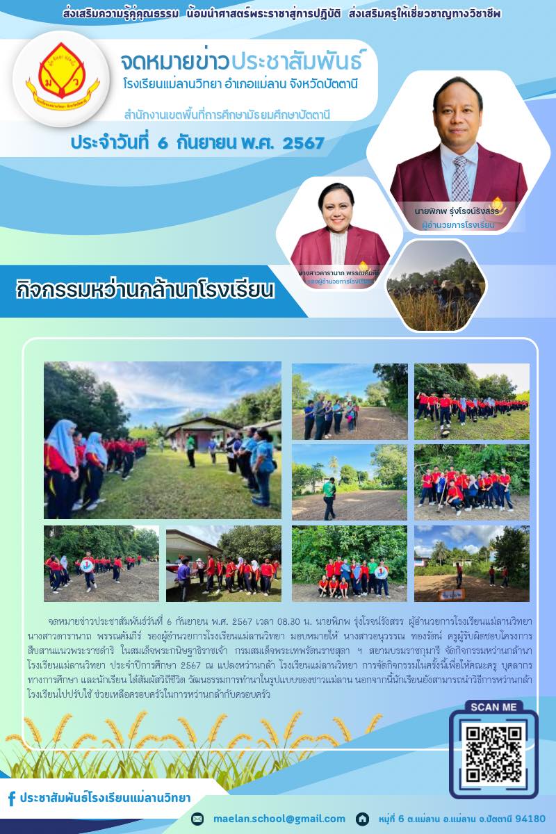 นายพิภพ รุ่งโรจน์รังสรร ผู้อำนวยการโรงเรียนแม่ลานวิทยา นางสาวดารานาถ พรรณคัมภีร์ รองผู้อำนวยการโรงเรียนแม่ลานวิทยา พร้อมด้วยคณะครู บุคลากร และนักเรียนโรงเรียนแม่ลานวิทยาจัดกิจกรรมหว่านกล้านาโรงเรียนแม่ลานวิทยา ประจำปีการศึกษา 2567 ณ แปลงหว่านกล้า โรงเรียนแม่ลานวิทยา