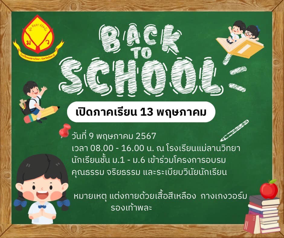 ประกาศเปิดภาคเรียน 1/2567 วันที่ 9 พฤษภาคม 2567 เวลา 08.00 - 16.00 น. ณ โรงเรียนแม่ลานวิทยา นักเรียนชั้น ม.1 - ม.6 เข้าร่วมโครงการอบรม คุณธรรม จริยธรรม และระเบียบวินัยนักเรียน