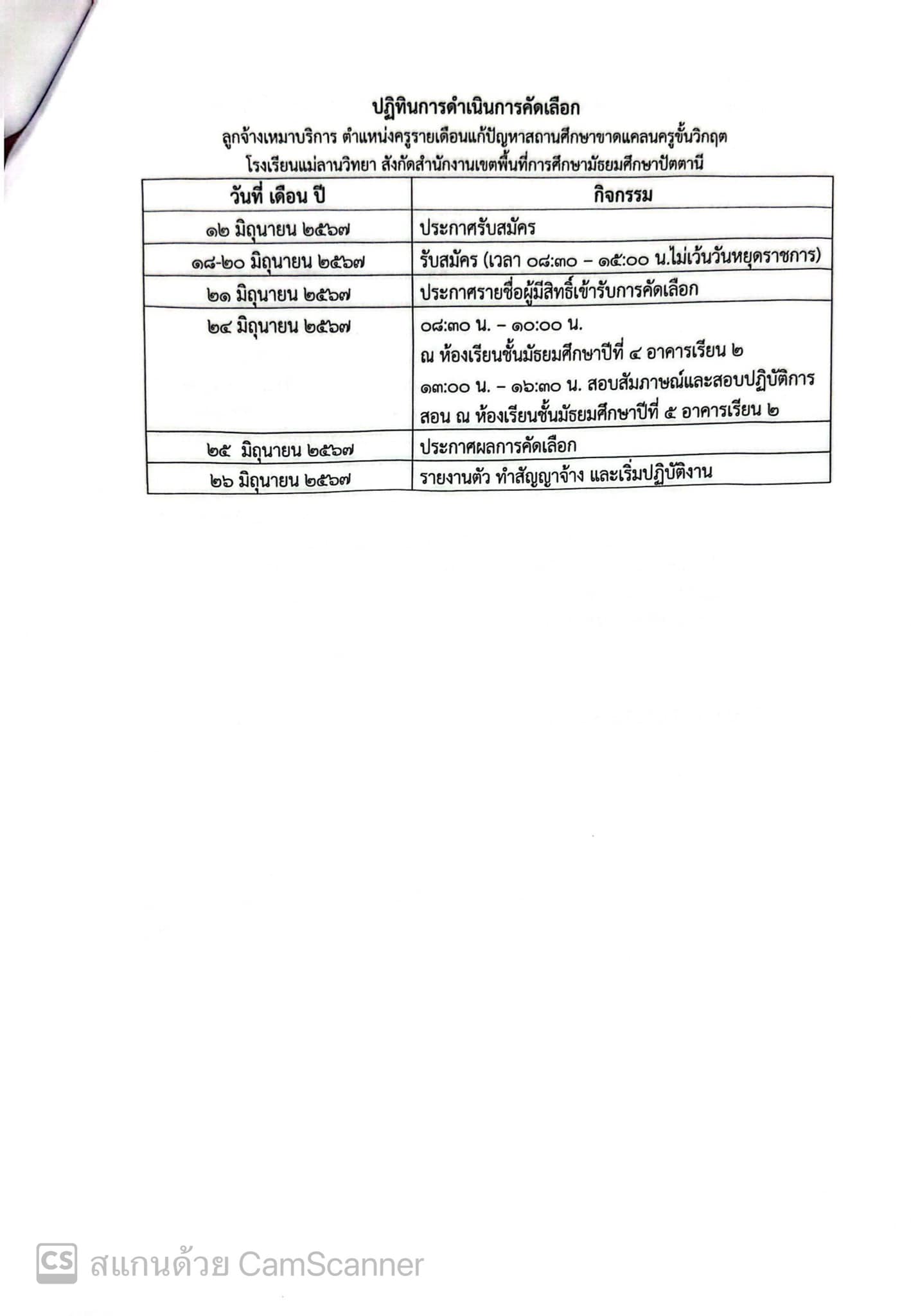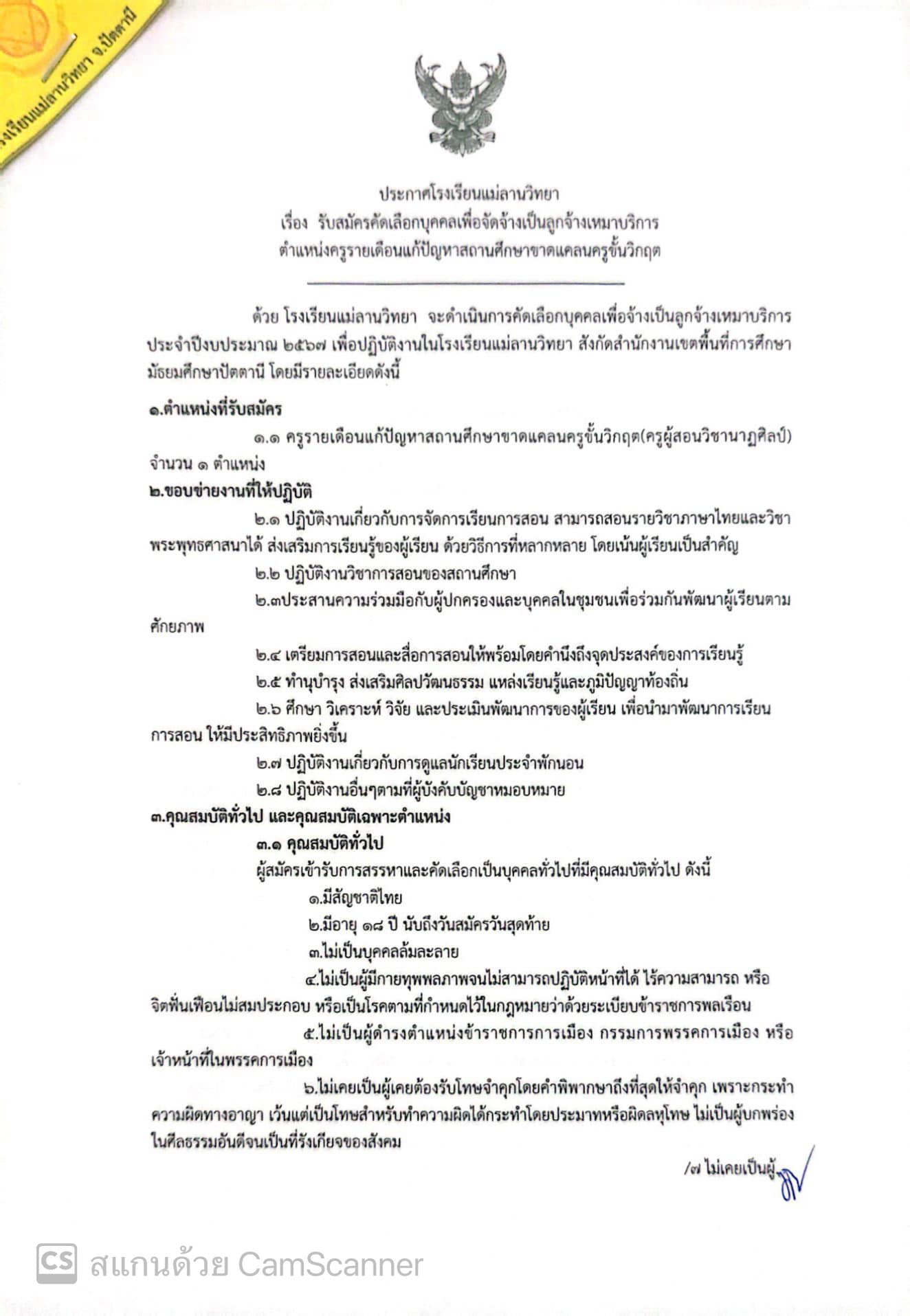 ประกาศโรงเรียนแม่ลานวิทยา เรื่อง รับสมัครคัดเลือกบุคคลเพื่อจัดจ้างเป็นลูกจ้าง ตำแหน่งครูรายเดือนแก้ปัญหาสถานศคกษาขาดแคลนครูขั้นวิกฤต