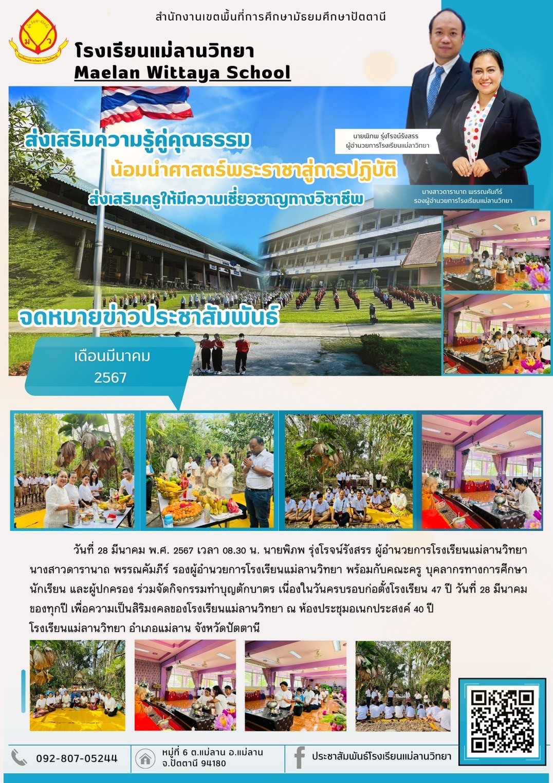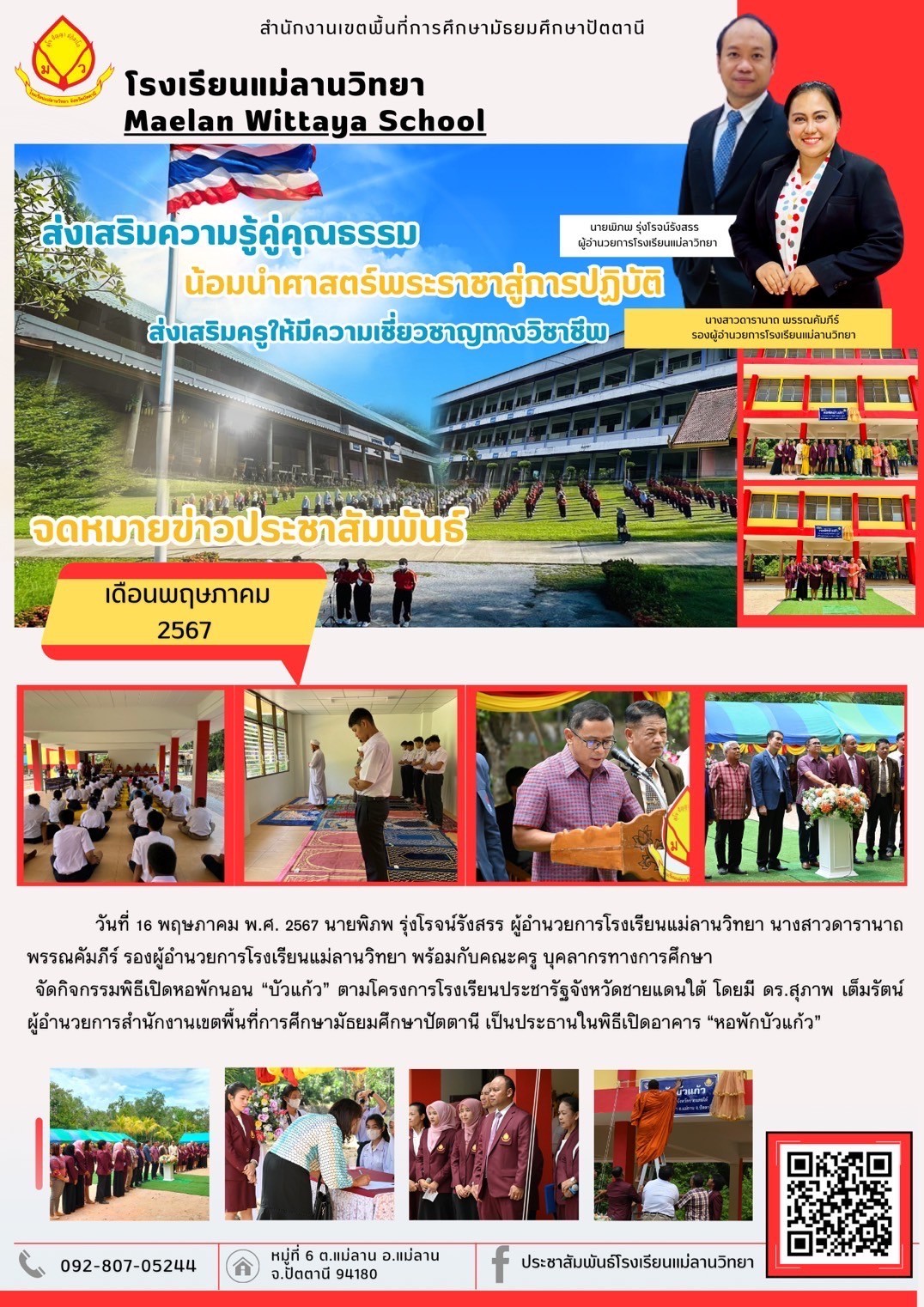 นายพิภพ รุ่งโรจน์รังสรร ผู้อำนวยการโรงเรียนแม่ลานวิทยา นางสาวดารานาถ พรรณคัมภีร์ รองผู้อำนวยการโรงเรียนแม่ลานวิทยา พร้อมด้วยคณะครู บุคลากร และนักเรียน จัดกิจกรรมเปิดหอพักนอน "บัวแก้ว" ตามโครงการโรงเรียนประชารัฐจังหวัดชายแดนใต้ โดยมี ดร.สุภาพ เต็มรัตน์ ผู้อำนวยการสำนักงานเขตพื้นที่การศึกษามัธยมศึกษาปัตตานี เป็นประธานในพิธีเปิดอาคาร